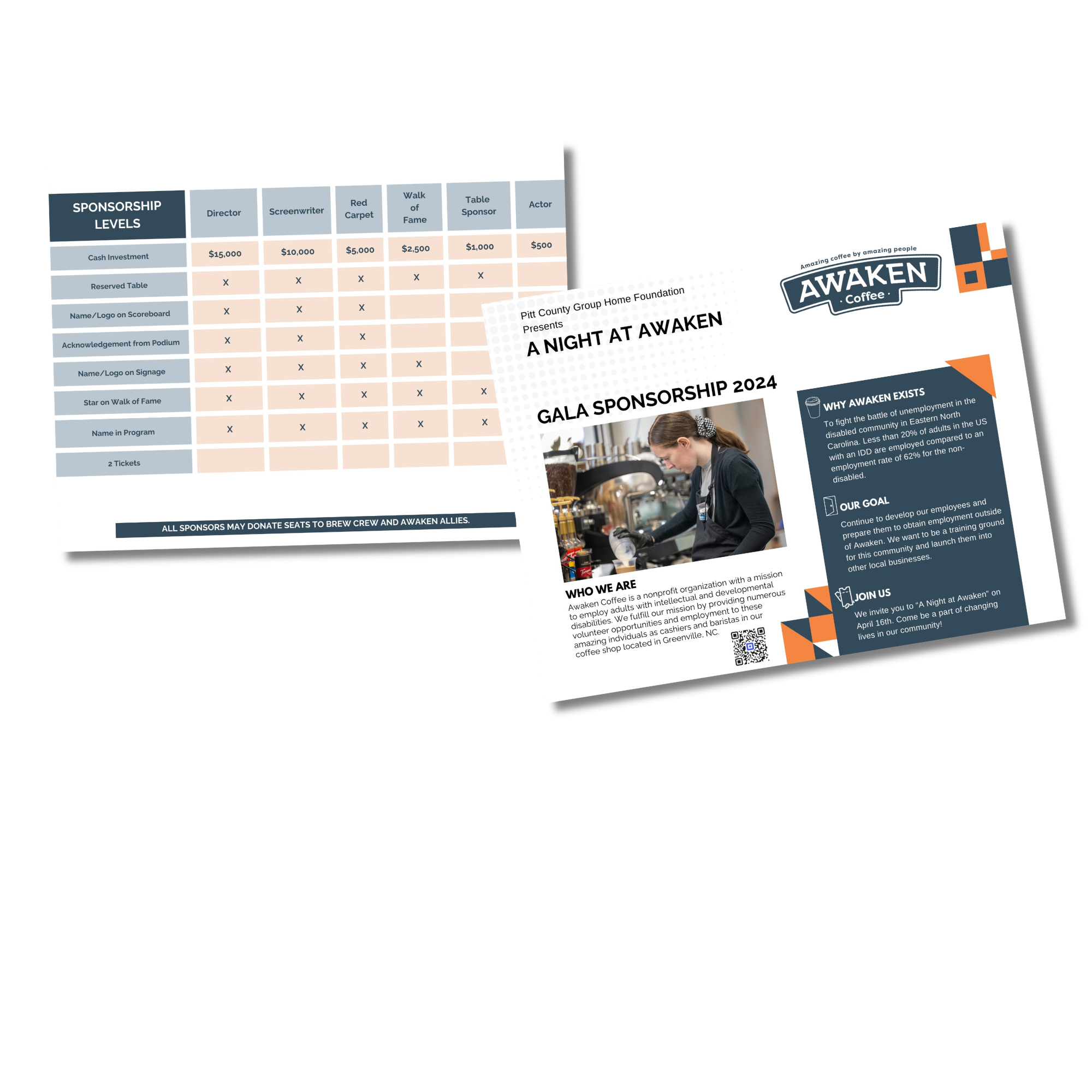 In addition to the website, a range of supporting materials were developed to strengthen brand consistency across touchpoints. These included 12 oz coffee bag packaging, printed and digital menus, in-store signage, employee training packets, and fundraising materials such as pledge cards and sponsorship handouts. Each piece was crafted to feel cohesive, intentional, and aligned with the brand’s heart.